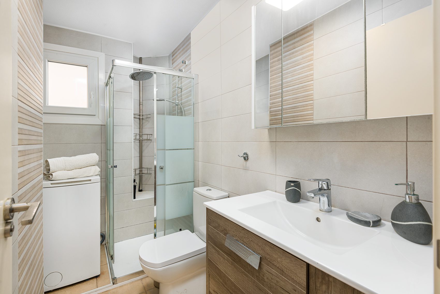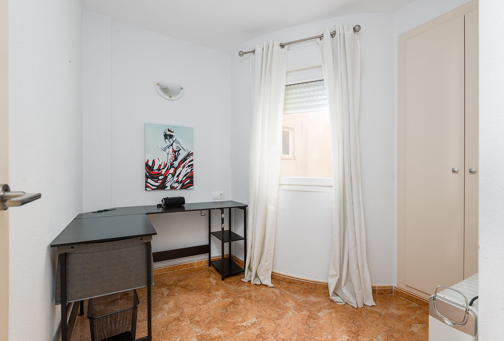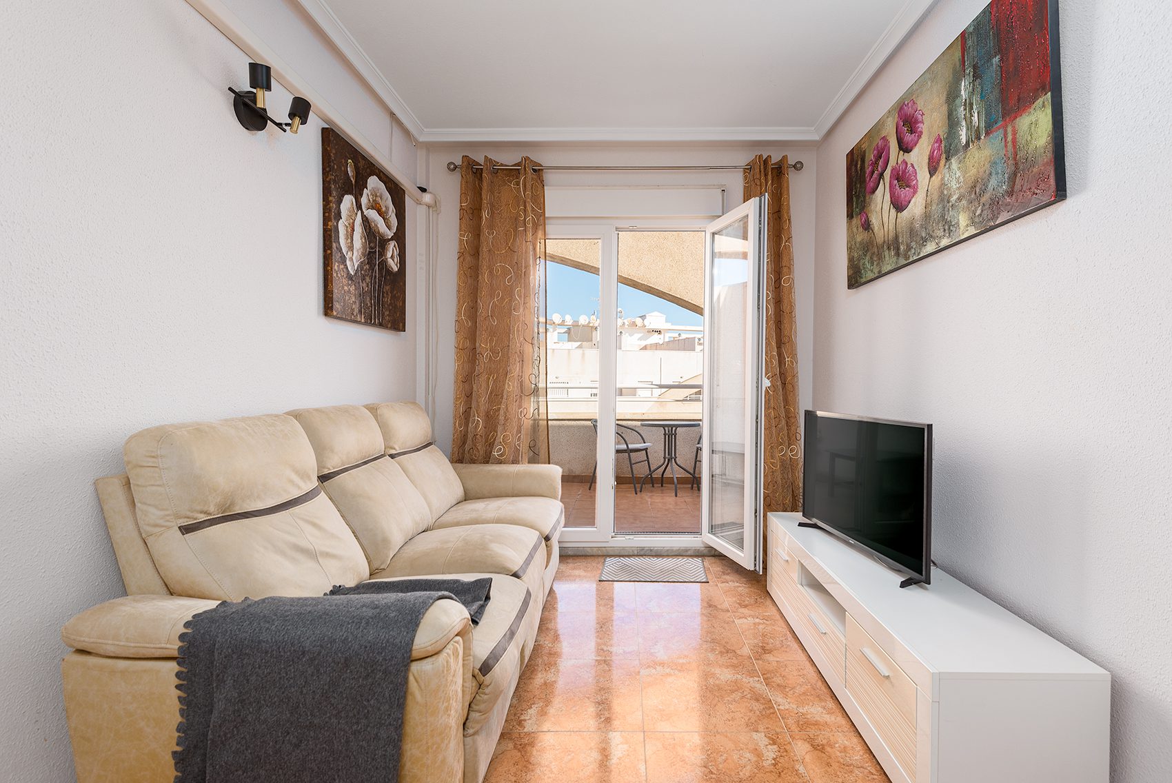 The absolute highlight of the apartment is the spacious terrace, which offers sweeping views over the rooftops all the way to the salt lake—the perfect place to enjoy the sun and the laid-back Mediterranean evenings.